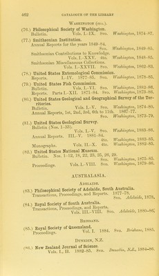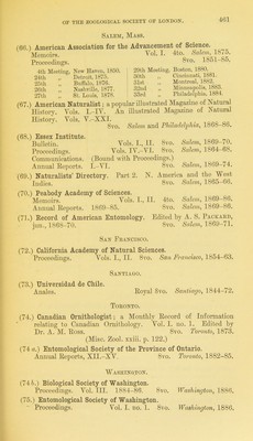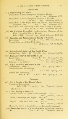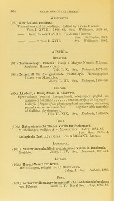 ![Wei,lingtok. (96.) New Zealand Institute. Transactions and Proceediu{!;H. Edited by James Hectou. A^ols. I.-XVin. 1868-85. 8vo. Welliwjlon, 1869-86. . Index to vols. I.—VIII. By .Iames llECXon. 8vo. Welli'iufton, 1877. . to vols. I.-XVII. 8vo. Welliwjton, 1886. AUSTEIA. Budapest. (97.) Termeszetrajzi Fiizetek : kiadja a Magyar Nemzeti Muzeum. Szerkeszti Herman 0tt6. Vols. I.-X. 8vo. Budapest, 1877-86. (98.) Zeitschrift fiir die gesammte Ornitkologie. Herausgegeben Julius von Madaeasz. Jahrg. I--III. 8vo. Budapest, 1884-86. Cracow. (99.) Akademija ITmiejetnosci w Krakowie. Sprawozdanie komisyi fizyografieznej, obejmujace poglad na czynnos’ci dokon’ane oraz materyjaly do fizy]ografii Gralicyi. [Report ofiliepliysiographical commission, embracing remarks on active researches together with materials of Galician physiography.] Vols. ri.-XIX. 8vo. KraTcowie, 1868-85. Graz. (100.) Naturwissenschaftlicher Verein fiir Steiermark. Mittheilungen, redigirt A. v. Mojsisotics. Jahrg. 1881-83. 8vo. Crraz, 1882-84. Zoologische Institut zn Graz. See GEEMAXT, Leipzig. Innsbruck. (101.) Naturwissenschaftlich-medizinischer Verein in Innsbruck^ ^ Berichte. Jahrg. I.-IV. 8vo. Innsbrucl-, 1870-74. Laibach. (102.) Mnseal-Verein fiir Krain. Mittheilungen, redigirt von C. Deschmann. , V, Jahrg. I. 8vo. Lawach, 18ob. Prag. n03.1 Archiv fiir die naturwissenschaftliche Landesdurchforschimg von Bdhmen. Biinde I.-V. Eoyal 8vo. Prag, 1869-86.](https://iiif.wellcomecollection.org/image/b24864419_0474.jp2/full/800%2C/0/default.jpg)