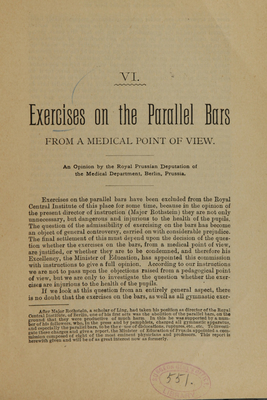 Exercises on the parallel bars from a medical point of view : an opinion / by the Royal Prussian Deputation of the Medical Department, Berlin, Prussia.