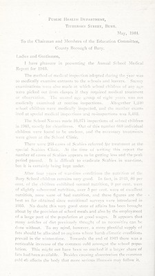 ![. Public Heal'iu Department, Tithebarn Street, Bury. ■ ' Mav, 1944. y f To the Chairman and -Alembcrs of the Education Committee, County Borout^^h of Bury. (.adies and Gentlemen, . • I have pleasure in presentin<y the Annual School iMedical Report for 1943. The method of medical inspection adopted during' the year was to medically examine entrants to the. schools and lea\'ers. Survey examinations were also made at which school children of anv ai’e were picked out from classes if thev required medical treatment or observation, 'riie second age group of eight years was not medicallv examined at routine inspections. Altogether 1,240 sc'hool children were medicallv inspected, and the number exam- ined at special medical inspections and re-inspections was 3,402. 4'he School Nui'ses made 16,371 inspections of sch.ool children in 1943, mostly for cleanliness. Out of this num])er 008 individual children were found to be unclean, and the necessary treatments were given at the School Clinic. There were 203 cases cT S('abies referred f.or treatment at the special Scabies Clinic. At the time <>f writing this report the number of cases of Scabies appears to be getting- less and the j)eak period passed. It is dinicult to eradicate .Scabies in war-time, but it is certainlv being Icept under. -■\fter four ^■ears of war-time, conditions the nutrition of the Bury School children remains verv good. In fa('t, in 1913^ 80 per cent, of the children exhibited normal nutrition, 9 per cent, were of slig]-itlv subnormal nutrition, over fi per cent, were of excellent nutrition, none were of bad nutrition, and these figures are the • best so far obtained since nutritional surveys were introduced in 1937). No doubt this verv gwd state of affairs has been brought about by the prox'ision of school meals and also by the employment of a large part of tlie population at good wages. It appears that many articles of diet previouslv thought of as necessities can be done without. To mv mjnd, however, a more plentiful supply of fats should l.)e allocated to regions where harsh climatic conditions prevail in the winter-time. Towards the end of 1943 there was a noticeable iiK'rease of the common ('old amongst the school popu- lation. This might not have been so marked if a larger share of fats had been available. Besides ('ausing absenteeism the common cold affects the bod\' that meu'e serious illnesses may follow it.](https://iiif.wellcomecollection.org/image/b28968736_0022.jp2/full/800%2C/0/default.jpg)