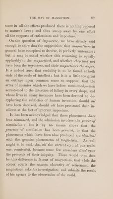 ![pursuits! And we venture to believe that the cause would not thus be abandoned by investigators, if they did not compromise their character in public by continuing to inquire patiently after an EK] Dorado non-entity :—and if the pursuit could be then quietly carried on, under the shade of friendly privacy. An extension of the same principle would operate bene- ficially in another sense, upon an investigator, who is de- terred from public inquiry, because the phenomena of magnetism rest on unknown principles, and its manifes- tations appear to be so eccentric from commonly received ideas, that it requires a high degree of moral courage to avow belief in effects which he may not be able to pro- duce, and is then counted for a fool ;—or which if he succeed in producing, he is immediately characterised as an impostor. This unhappy choice of character—knave or fool, dependent upon the avowal of a belief in the truth of certain effects absolutely before his eyes, is enough to make him shrink from the avowal, and shut his eyes rather than be convinced. The fact that the greater number of magnetisers and of magnetised are to be found among unscientific and ignorant persons, whose appetite for delief is generally in proportion to their profound absence of knowledge ; and who have exhibited these characteristics by the ab- surdity of their publications, and by their close alliance with all kinds of quackery, has also formed a ground of objection against magnetism. It will be easily seen, how naturally this arises from the foregoing considerations ; while that portion of the objection which relates to the](https://iiif.wellcomecollection.org/image/b33492967_0103.jp2/full/800%2C/0/default.jpg)