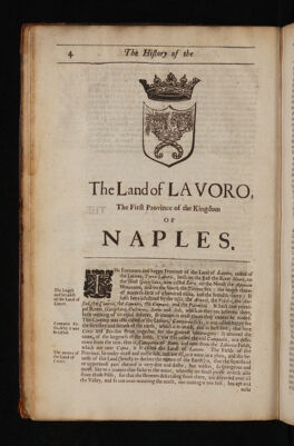 Credit: Parthenopoeia, or the history of the most noble and renowned kingdom of Naples. With the dominions therunto annexed, and the lives of all their kings. The first part by that famous antiquary Scipio Mazzella, made English by Mr. Samson Lennard, herald of armes. The second part compil'd by James Howell, esq.; who, besides som supplements to the first part, drawes on the threed of the story to these present times, 1654. Illustrated with the figures of the kings, and the arms of all the provinces... / [Scipione Mazzella]. Source: Wellcome Collection.