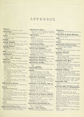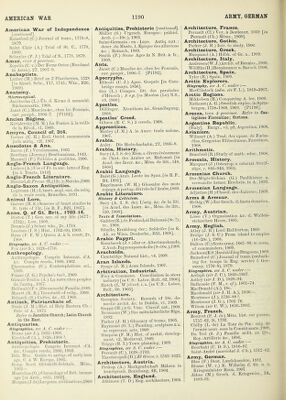 ![AMERICAN WAR American War of Independence ! Rainsford (C.) Journal of trans., 1776-8, 1879. Saint Clair (A.) Trial of St. C., 1778, 1880. Schuyler (P. J.) Trial of S., 1778, 1879. A.mur, river proririoe. Zepeliii (C. v.) Der Feme Osteu (Russland in Asien), 2T, 1907-9. Anabaptists. Luther (M.) Brief an 2 Pfarrherren, 1528 [in Siimtl. Sclu'., T17, 1715; Wke., B26, 1909]. Anatomy. Microscopical. Jacobsohn (L.) lib. d. Kerne d. menschl. Riickenmarks, 1908. Janet (C.) Muscles &c., chez les Fourmis, var. pamph., 1906-7. [P1192]. Ancien Rdgime. Kovalevsky (M. M.) La France a, la veille de la E6vol., tl, 1909. Ancyra, Council of, 314. Turner (C. H.) Eccl. Occid. monumenta juris antiq.. v2i, 1907. Anecdotes & Ana. Bacon (F.) Verulamiana, 1803. Bentham (Jeremy) Benthamiana, 1843. Maxwell (P.) Pribbles & prabbles, 1906. Anglo-French Language. Luders (A.) Use of Fr. in anc. laws of Eng. [in h. Tract.?. 1810]. Anglo-French Literature. Siimund,del'reine. a3.(12c.);Matzke,1909. Anglo-Saxon Antiquities. Logeman (H.) L’inscr. angl.-sax. du reliq. de la vraie croix, Bruxelles, 1891. Animal Lore. Garver (il. S.) Sources of beast similes in It. Ivric of 13c. [in K. F., B21, 1007]. Anne, Q. of Gt. Brit., 1702-14. Boston (T.) Gen. acc. of my life (1677- 17.32); Low, 1908. Dennis (J.) Select wks., 2v, 1718. Leadam (I. S.) Hist., 1702-60, 1909. Ryan (P. F. W.) Queen A. & h. court, 2v, 1908. Biography, see A. C. under :— Fox [sir S.;. 1626-1716. Anthropology. Anthropologic. Congres Internal. d’A. icc. Compte rendu, 1900, 1902. Flammarion (C.) Contemplations .sci., 1909. Frazer (.7. G.) P.syche’s task, 1909. Giraud-Tenlon (A.) La m6re chez jjcuples de I’antiq., 1867. Hellwald('F.v.)Diemen.schl.Familie,1889. Marett (It. It.) Thre.shold of relig., 1909. Reinach (S.) Cultes, Ac., t3,1908. Antioch, Patriarchate of. Neale (J, M.; Hi.st. of Holy Ea.stern Ch. : Pair, of A., 1873. Jtefer to Jacobite Church; Latin Church in the East. Antiquaries. Biographies, see A. C. under : — Evans [sir J.), 1823-1908. Kirchhoff rA.>. 1826-1908 ?. Antiquities, Prehistoric. Arithro[K>h8tic'. Ojngrfcs Internat. d’A. ie., fknnpt.e rfmdii, 19(X). 1902. Brit .Mils. Guide to antiqs. of fKirly iron rre.., G, k. W. EiiroiK;, 1905. K'.rn'. Nord. Oldskrift-Sclekab. M(m., MonteliiisfO.; f hronology of Brit, bronze age [in Arch.. v61), 1908]. M'-rgan ('J.de)Le“iirem. civilisations, 1909 Antiquities, Prehistoric [oontinuedi\. Muller (S.) Urgesch. Europas; prahist. Arch. (—10c.), 1905. Saint-Germain - en - Laye. Antiq. nat.: descr. du Musee, 1, Epoque des alluvions &c.; Reinach, 1889. Smith (F.) Stone Ages in N. Brit. & Ir., 1909. Ants. Janet (C.) Muscles &c. chez les Fourmis, var.pamph., WOG-7. [P1192]. Apocrypha. Ellicott (0. J.) Apoc. Gospels [in Cam- bridge essays, 1856]. Gry (L.) Compos, litt. des paraboles d’Henoch ; St op. [in Museon (Le) N.S., v9, 1908]. Apostles. Dollinger. Xtenthum Ac., Grundlegung, 1868. Apostles’ Creed. Gibson (E. C. S.) 3 creeds, 1908. Apprentices. Motley (J. M.) A. in Amer. trade unions, 1907. Arabia. Auler. Die Hedschasbahn, 2T, 1906-8. Arabia, History. Sacy (A. I. S. de) Mem.s. diversSvenemens de I’hist. des Arabes av. Mahomet [in Acad, des Inscr. &c., Mem. de litt., t48, 1808]. Arabic Language. Baist(G.) Arab. Laute im Span, [in R. F., B4, 1891]. Engelmann (W. H.) Glossaire des mots espagn.&portug.deriv6sderArabe,1869. Arabic Literature. History & Criticism. Sacy (A. I. S. de) L’orig. Ac. de la litt. [in Acad, des Inscr. Ac., Mem. de litt., t50, 1808]. Texts & Translations. Galtier(E.),iir. FoutouhalBahnasa (9c. ?); tr., 1908. Sibylle, Erzahlung der ; Schleifer [in K. Ak. zu Wien, Denkschr., B53, 1908]. Arabic Papyri. Karabacek (J. v.)Zur or. Altertumskunde, 2, Arab. Papyrusprotokolle (9-10c.),1908. Arachnida. Cambridge Natural hist., v4, 1909. Aran Islands. Synge (J. M.) Aran Islands, 1907. Arbitration, Industrial. Frey A Commons. Conciliation in stove industry [wi. U.S.; Labor, Bull., 62,1906], Hatch (L. W.) Govt. i. a. [in U.S.: Labor, Bull., 60, 1905]. Architecture. Georgian Society. Records of 18c. do- me.stic archit. Ac. in Dublin, vl, 1909. Guppy (H.) A G. Vine. Classif. cat., 1909. Neumann (W.) Das mittelalterliche Riga, 1892. Barker (J. H.) Glossary of terms, 1905. Raymond (G. L.) Painting, sculpture A a. as represent, arts, 1909. Simpson (F. M.) Hist, of archit. develop- ment, v2. Mediaeval, 1909. Triggs (R. I.) 'J’own jJanning, 1909. Biographies, see A. C. under Perraiilt (C.), 1628-1703. Theotocopuli (D.),/i’Z Green, c. 1545-1625. Architecture, Austria. Brokop (A.) Markgrafschaft Miihrcn in kunstgesch. Beziehung, 4B, 1904. Architecture, England. 1 Atkinson (T. D.) Eng. architecture, 1904. Architecture, France. Perrault (Cl.) Voy. ^ Bordeaux, 1669 [in Perrault (Ch.) Mems., 1909]. Architecture, Gothic. Parker (J. H.) Intr. to study, 1906. Architecture, Greek. Marquand (A.) Hdbk. of Gr. a., 1909'., Architecture, Italy. Anderson(W.J.) Archit. of Renaiss., 1909. WolfHin (H.) Renaissance u. Barock, 1908. Architecture, Spain. Tyler (R.) Spain, 1909. Arctic Explorers. Biography, see A. C. under :— MacClintock (adm. wrF.L.), 1819-1907. Arctic Regions. Mikkelsen (E.) Conquering A. ice, 1909. Nathorst (A. G.) Swedish explor. in Spitz- bergen, 1758-1908, 1909. [P1198]. Arezzo, town S' province. Refer to Cas- tiglione Fiorentino; Cortona. Argentine Republic. [Italy]. Emigr., v3, p2, Argentina, 1908. Arianism. Wilmart (A.) Trad, des opusc. de Foeba- dius, Gregorius Illiberitanus,FaustinuSr 1908. Arithmetic. Branford (B.) Study of math, educ.,1908. Armenia, History. Marquart (J.) Osteurop. u. ostasiat. Streif- ziige, c. 840-940, 1903. Armenian Church. Der-Megerdechian (G.) Paulikianer u. verwandte ketzer. Erschein. in A., 1893. Armenian Language. Adjarian (H.) Classif. des dialectes, 1909. Arms & Armour. Helbig (W.) Zur Gesch. d. hasta donatica,. 1908. Army, Austrian. Lowe (V.) Organisation fee. d. Wallen- steinschen Heere, 1895. Army, English. Atlay (J. B.) Lord Haliburton, 1909. Brid