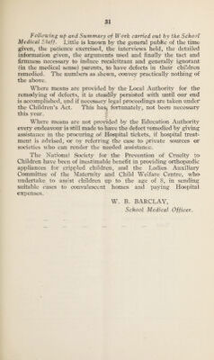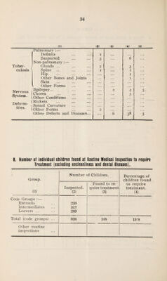 ![(1) (1) (3) (41 (5) Pulmonary : — Definite i • • • ... Suspected 3 6 • • • Noil-pulmonary : — Tuber- J Glands ... 2 3 culosis ) Spine I i Hip . i Other Bones and Joints i Skin ... Other Forms ... Nervous l System, j Epilepsy... Chorea Other Conditions 2 4 3 5 Deform- ities. ] Rickets Spinal Curvature ... ... Other Forms 2 . . . Other Defects and Diseases... **'• 6 38 3 B. Number of individual children found at Routine Medicai Inspection to require Treatment (excluding uncleaniiness and dental diseases). Group. Numter of Children. Percentage of children found Inspected. Found to re- to require 0) quire treatment treatment. (2) (3) (4) Code Groups : — Entrants 238 Intermediates 317 Leavers ... 283 Total (code groups) ... 838 108 13*8 Other routine inspections](https://iiif.wellcomecollection.org/image/b30268382_0036.jp2/full/800%2C/0/default.jpg)