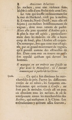 Anciennes relations des Indes et de la Chine, de deux voyagers mahometans [Sulaiman and Hasan Ibn Yazid] qui y allerent dans le neuvième siecle / traduites d'arabe: avec des remarques sur les principaux endroits [by E. Renaudot].