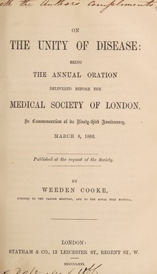 On the unity of disease : being the annual oration delivered before the Medical Society of London, in commemoration of its ninety-third anniversary, March 8, 1866 / by Weeden Cooke.