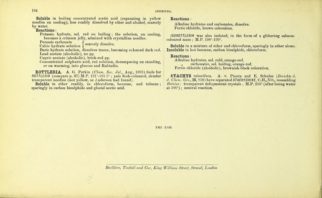 Credit: Dictionary of the active principles of plants: alkaloids : bitter principles; glucosides; their sources, nature, and chemical characteristics / with tabular summary, classification of reactions, and full botanical and general indexes. By Charles E. Sohn. Source: Wellcome Collection.