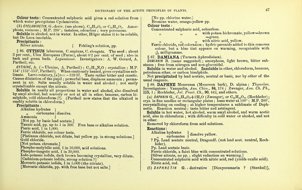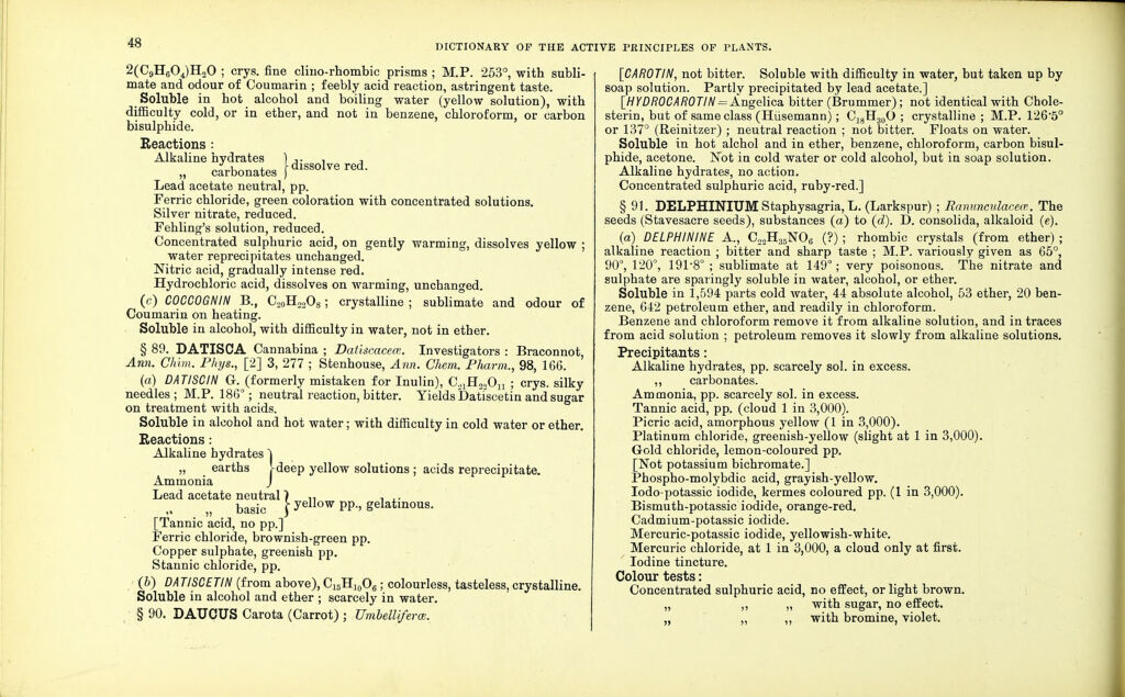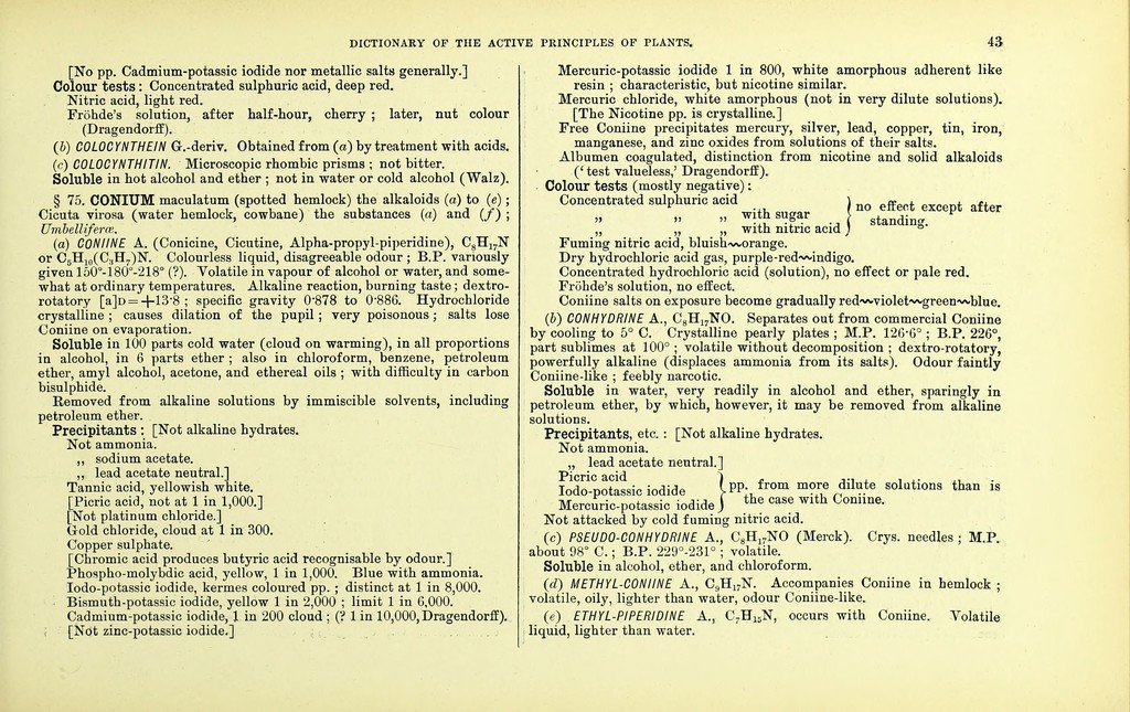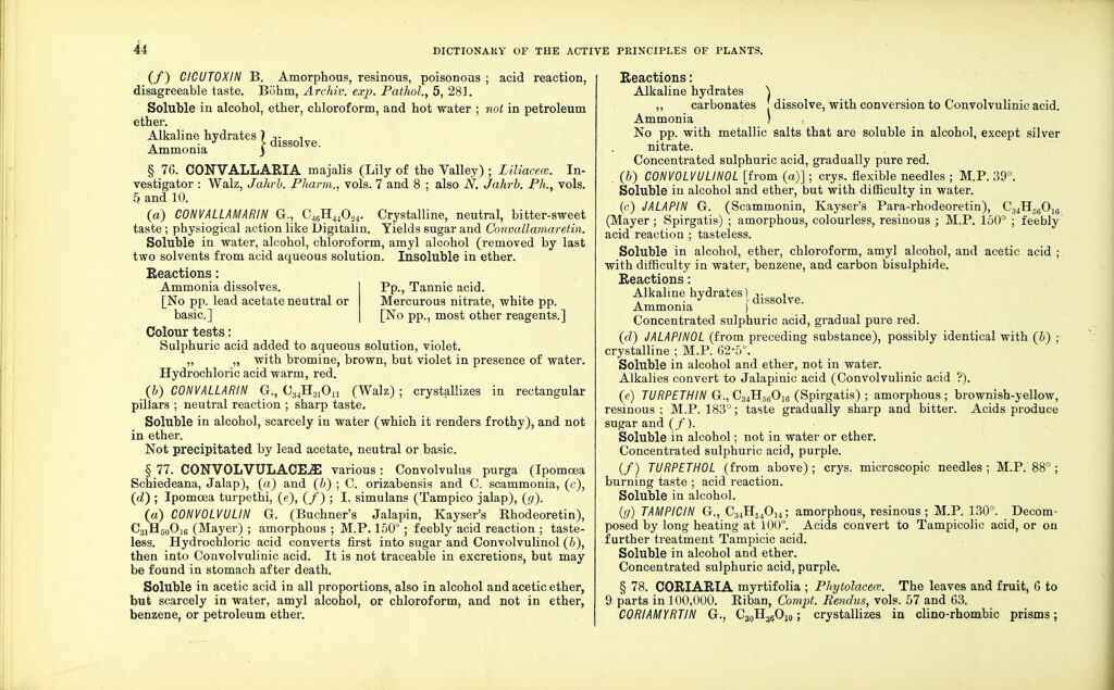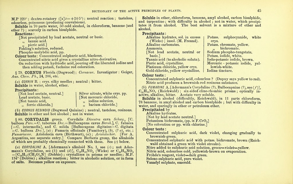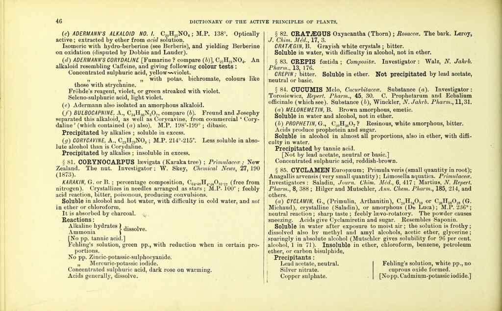 Credit: Dictionary of the active principles of plants: alkaloids : bitter principles; glucosides; their sources, nature, and chemical characteristics / with tabular summary, classification of reactions, and full botanical and general indexes. By Charles E. Sohn. Source: Wellcome Collection.