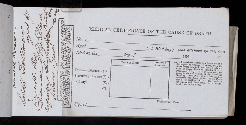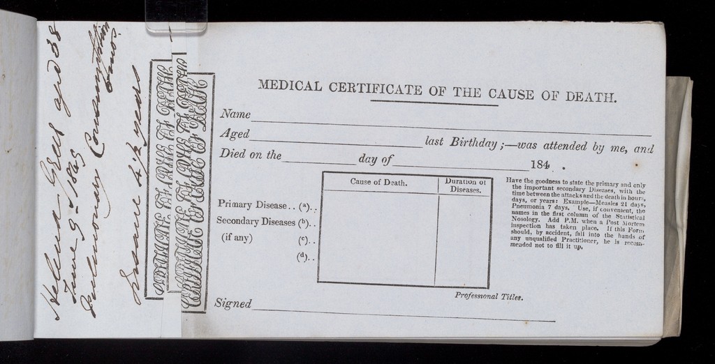 Credit: Book of Forms: 'Medical Certificates of the Cause of Death'. Source: Wellcome Collection.