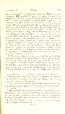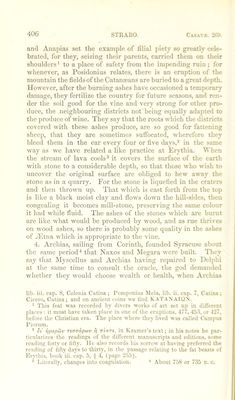 ![and Anapias set tlie example of filial piety so greatly cele- brated, for they, seizing their parent.?, carried them on their shoulders' to a place of safety from the impending ruin ; for whenever, as Posidonius relates, there is an eruption of the mountain the fields of the Catana3ans are buried to a great depth. However, after the burning ashes have occasioned a temporary damage, they fertilize the country for future seasons, and ren- der the soil good for the vine and very strong for other pro- duce, the neighbouring districts not being equally adapted to the produce of wine. They say that the roots which the districts covered with these ashes produce, are so good for fattening sheep, that they are sometimes suffocated, wherefore they bleed them in the car every four or five days,* in the same ■way as we have related a like practice at Erythia. AVhen the stream of lava cools® it covers the surface of the earth with stone to a considerable depth, so that those who wish to uncover the original surface are obliged to hew away the stone as in a quarry. For the stone is liquefied in the craters and then thrown up. That which is cast forth from the top is like a black moist clay and flows down the hill-sides, then congealing it becomes mill-stone, jweserving the same colour it had while fluid. The ashes of the stones which are burnt are like what would be produced by wood, and as rue thrives on wood ashes, so there is probably some quality in the ashes of yElna which is appropriate to the vine. 4. Archias, sailing Irom Corinth, founded Syracuse about the same ])eriod‘‘ that Naxos and Megara were built. They say that INlyscellus and Archias having repaired to Delphi at the same time to consult the oracle, the god demanded whether they would choose wealth or health, when Archias lib. iii. cap. S, Colonia Cntiiia ; Ponipoiiius Mela, lib. ii. cap. 7, Calina; Cicero, Catina; and on ancient coins ue lind K.\T.AXAUJ'S. ‘ This feat was recorded by divers works of art set up in different places ; it must have taken place in one of the eruptions, 477, 453. or 4‘27, before the Christian era. The place where they lived w.as called Camptts Pioruni. ’ St’ ii/iiptoy nnaaptai' i) Trim, in Kramer’s text; in his notes he par- ticularizes the rcadinjrs of the dilfercnt manuscripts and cditiotis, some rcadinp forty or fifty. He also records his sorrow at havinp preferred the readiuR of lifty days to thirty, in the passage relating to the fat beasts of Krythia. hook iii. cap. 5, ^ 4, (page 2.55). “ Literally, changes into coagulation. * .\bout 75S or 735 e. c.](https://iiif.wellcomecollection.org/image/b24872556_0001_0420.jp2/full/800%2C/0/default.jpg)