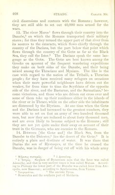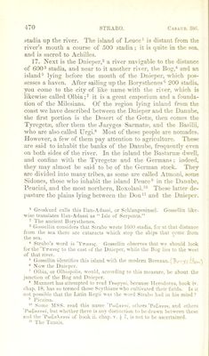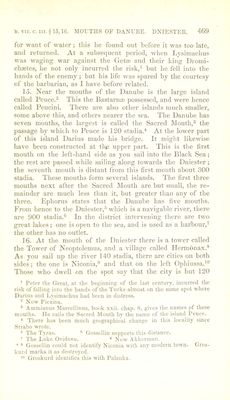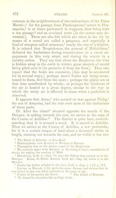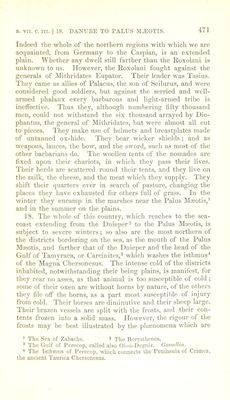 ![common in the neighbourhood of the embouchure of the Palus Mmotis ; * for the passage from Panticapmurn,^ across to Pha- nagoria,® is at times performed in waggons, thus l>eing both a sea passage'* and an overland route [as the season may de- termine]. There are also fish which are taken in the ice by means of a round net called a gangama, and especially a kind of sturgeon called antacseus,’ nearly the size of a dolphin. It is related that Neoptolemus, the general of Mithridates,** defeated the barbarians during summer-time in a naval en- gagement in this very strait, and during the winter in a cavalry action. They say that about the Bosphorus the vine is hidden away in the earth in winter, great mounds of mould being piled over it [to jireserve it from the frost]. They also report that the heats are excessive, [this may be accounted for in several ways,] perhaps men’s bodies not being accus- tomed to them, feel them the more; perhaps the plains are at that time unrefreshed by Avinds; or perhaps the thickness of tlie air is heated to a great degree, similar to the way in Avhich the misty air is affected in times Avhen a parhelion is observed. It appears that Ateas, who carried on war against Philip,^ the son of Amyntas, had the rule over most of the barbarians of these parts. 19. After the island® situated opposite the mouth of the Dnieper, in sailing towards the east, we arrive at the cape of the Course of Achilles.'® The district is quite bare, notwith- standing that it is termed a wood. It is sacred to Achilles. Then tve arrive at the Course of Achilles, a low peninsula; for it is a certain tongue of laud about a thousand stadia in length, runuing out towards the east, and its width is but two * The Strait of Zabache, or Icni-Kale. - Panticapasum, now Kerisch or Wospor in Europe. ^ PhanaRoria was on the .Asiatic coast of the Bosphorus. We entirely agree with Kramer in favouring Coray's emendation of ttAoi'i' for the reading of MSS. * Herodotus, book iv. chap. .b.S, says this fishing was carried on in the Dnieper. ^Ellian, de Natur. .Animal, book siv. chap. 26, refers it to the Danube. Strabo has before alluded to this fact, book ii. chap. i. § 16, p. 114. ■ Ltician, in Macrob. ^ 10, spells his name .Anteas, and relates that he was killed in this war when uitwards of 90 years of age. Father of Alexander the Great. ® The Island of Berezan. M. Gossellin identifies this as Cape Czile.](https://iiif.wellcomecollection.org/image/b24872556_0001_0486.jp2/full/800%2C/0/default.jpg)