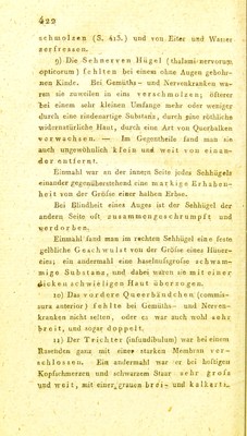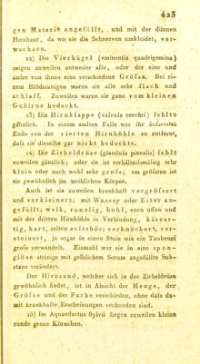 ![16) Der Hirnanhang, Schleimdrüse (glan- dula pituitaria. hypophysis) ist zuweilea ungewöhn- lich klein, w e i 0 ]i, e i n g e s c h r u m p f^, oder auch sehrgrofs, hart, Taserig, a u f g e s c h w o 1 ] e n, dick; — zuweilen mit vieler Feuchtigkeit angefüllt. Einmahl war er so grofs v/ie ein Ei, dabei schwam- mig und mit Eiter angefüllt. Auch sah man ihn misfarbig, dunkel, braungelb, und einmahl mit zwei grofs en widernatürlichen Anhängen. 17) Das kleine Gehirn war einmahl durch eine widernatüi-liche zweite Sichel eben so tief ge- theilt, als das grofse Gehirn. (S. S. 4i8. ) Die Zahl der Blätter im kleinen Gehirne variirt zwischen drei und achthundert. Bei Geistes- kiauken fand man zuweilen sehr wenige. B. Das Rückemiiark. a5g. a) Die Häute des Rückenmarks weitlien eten so mannigfaltig von der Regel »üb, wje die des Gehirnes. Bei der Wassersucht der Wirbelsäule (Hydrorachia) und der mit dieser häufig vergesell- schafteten Rückenspalte (spina bifida), bilden sie den Sack für die Wassergeschwulst, welche durch eine Oeffnung in der Wirbelsäule hervordringt. Zuweilen ist auch Wasser zwischen ihnen selbst angehäuft. 35) P. Frank'^de vertebialis columnae in morbis dignitatc. Paviae lygi. Saniml. auserl. Abli. f. pr. Aerzte. B. XV. S. 384. M e c k e 1 pathol. Anat. 1 B. S. 347f.](https://iiif.wellcomecollection.org/image/b21452933_0444.jp2/full/800%2C/0/default.jpg)