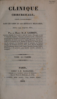 Clinique chirurgicale : exercée particulièrement dans les camps et les hopitaux militaires, depuis 1792 jusqu'en 1829 [1832,1836] / par le baron D.J. Larrey.