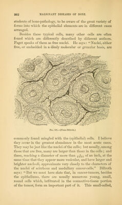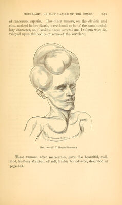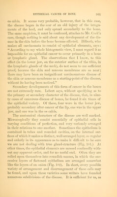 ![The stroma of epitlielial growths does not seem to be con- stant or always well defined. In many cases, and I think always in bone, no proper alyeolar stroma, such as has been described in connection with medullary cancer, exists. The tissues are merely displaced for the reception of the new deposit, and what fibrous structures we find trayersing the morbid mass are prob- ably deriyed from modifications of preexistent normal tissues. In the tubular and follicular forms, the substance of the tube or follicle, which is lined by epithelium, may be supposed to be a direct derivatiye from the normal tissue, of which it is usually only an exaggeration. These tumors are permeated with a certain amount of fluid, cancer-juice, as it is called; and, as the cells have but little cohesion among themselyes, there is easily scraped off, from the cut surface, a milky fluid, which is made so by containing great numbers of the epithelial cells floating through it, sus]5ended, as in an emulsion. The clinical features of epithelioma, wherever situated, are mainly those of ulceration. Most epithelial cancers are really cancerous ulcers from their commencement. In and about the base of these ulcers, the cancerous deposit is constantly taking place, so that, as the ulcer grows, the cancer increases; and it is rather uncommon for an epithelioma to gain any great size as a tumor, on account of its constant tendency to ulcerative destruc- tion. In the bones these features are somewhat modified, ac- cording as the deposit reaches the osseous tissue from an ulcer- ated cutaneous surface, or by infection from a distant tumor. Of cases travelling subcutaneously, and infecting bones deep- seated and distant from the focus of disease, Yirchow gives one instance, in a man aged fifty-nine, who had an ulcerating epithe- lial cancer of the left breast. On the 5th of February, 1853, the left breast and several enlarged axillary glands were re- moved by operation. The man died with symptoms of pypemia, February 21st. At the autopsy, marked lesions, characteristic of pyaemia, were found. The ribs, from the third to the sixth on the right side, were infiltrated with epithelial cancer. The vertebral end of the first rib on the left side was also similarly infiltrated. In the upper part of the left mediastinum were found several small nodules of epithelial growth. There seemed](https://iiif.wellcomecollection.org/image/b21014413_0378.jp2/full/800%2C/0/default.jpg)