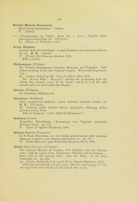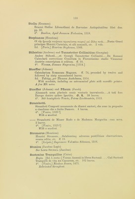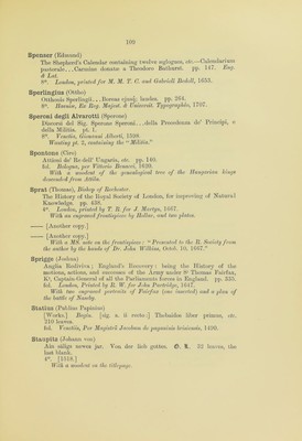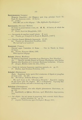![Sauromannus Georgius) Hispanie Consolatio.—Ad Hispanos post Aug. principis Caroli Ko. Regis El. discessum oratio. 24 leaves. 4°. [1520.] With MS. note on the titlepage: “ Duo Bijlibaldo Pijrclikeijmero.” Savonarola (Giovanni Michele) De Gotta la pi’eservatione e cura, etc. €>. It. 40 leaves, of which the last is blank. 4°. Pauia, Jacob dal Borgofradio, 1505. Savonarola de omnibus mundi balneis. ff. xxxv. fol. Venetiis, per Cristoferu de Pensis de Mandello, [1497 ?] Practica Joannis Michaelis Sauonarole. ff. 277. fol. Venetiis, per Bernardinu Uercellesez, 1502. The last leaf is not numbered. Scamozzi (Vicenzo) Discorsi sopra l’Antichita di Roma . . . Con XL Tauole in Rame. 54 leaves. fol. Venetia, Francesco Ziletti, 1583. With engraved titlepage. Schade (Petrus) Mosellanus. De Ratione disputandi, praesertim in re Theologica, Petri Mosellani . . . oro. . . . Epistola qutedam Erasmi ad Petrum Mosellanum, mire festiua. Epistola item Erasmica ad d. doctorem Martinum Lutherium. 1G leaves. 4°. [Leipsic, Melchior Lotter the elder, 1519.] • Oratio de variarum linguarum cognitione paranda, etc. pp. G7. 4°. Basilese, Apud Ioannem Frobenium, 1519. Schedel (Hartmannus) Begin. Registrum huius operis libri cronicarum cu figuris et ymagibus ab inicio mudi. fol. 299. fol. Nurcmberge, Anthonius Koberger, 1493. The work knoion as the “ Nuremberg Chronicle.” Imperfect; wanting the five leaves after the colophon. Fol. 1 is illuminated. Copiously illus- trated with woodcuts, and with a ivoodcut map at the end. Schemer (Christophorus) Refractiones cudestes, sive solis elliptici phenomenon illustratum, etc. pp. 132. 4°. Ingoldstadii, ex Oficina Ederiana, apud Elisabetham Angermariam, 1617. Sol elliptic : hoc est novum tt perpetuum Solis contrahi Soliti Phamo- menon . . . nouiter inventum, etc. pp. 34. 4°. Augnstsc Vindelicorum, iypis Christopliori Mangij, 1G15.](https://iiif.wellcomecollection.org/image/b24855492_0109.jp2/full/800%2C/0/default.jpg)