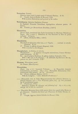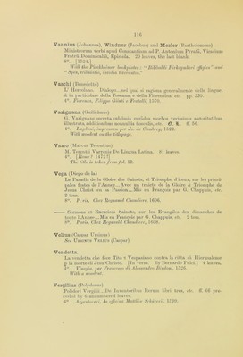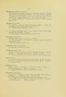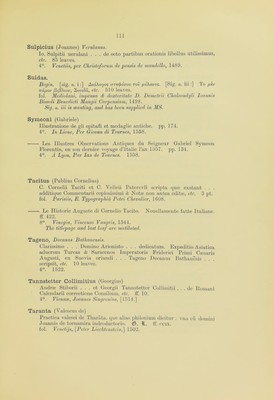 ![Sulpicius (Joannes) Verulanus. Io. Sulpitii uerulani . . . de octo partibus orationis libellus utilissimus, etc. 85 leaves. 4°. Venetiis, per Christo/orum de pensis de mandello, 1489. Suidas. Begin, [sig. a. i :] AtaAoyos arecfidvov tov peXavos. [Sig. a. iii :] To pev 7rapov (difiXiov, 2omSa, etc. 510 leaves. fob Mediolani, impensa & dexteritate I). Demetrii Chalcondyli Ioannis Bissoli Benedicti Mangii Carpensium, 1498. Sig. a. iii is wanting, and has been supplied in MS. Symeoni (Gabriele) lllustratione de gli epitaffi. et medaglie anticbe. pp. 174. 4°. In Lione, Per Giovan di Tournes, 1558. Les Illustres Observations Antiques du Seigneur Gabriel Symeon Florentin, en son dernier voyage d’italie ban 1557. pp. 134. 4°. A Lyon, Par Ian de Tournes. 1558. Tacitus (Publius Cornelius) C. Cornelii Taciti et C. Velleii Patercvli scripta qu* exstant . . . additique Commentarii copiosissimi & Not* non autea edit*, etc. 3 pt. fol. Parisiis, E. Typographic, Petri Chevalier, 1608. Le Plistorie Auguste di Cornelio Tacito. Nouellamente fat.te Italiane. ff. 422. 8°. Vinegia, Vincenzo Vaugris, 1544. The titlepage and last leaf are mutilated. Tageno, Decanus Bathauensis. Clarissimo . . . Domino Arionisto . . . dedicatum. Expeditio Asiatica aduersus Turcas & Saracenos Imperatoris Friderici Prirni Ctesaris Augusti, ex Suevia oriundi . . . Tageno Decanus Bathauesis . . scripsit, etc. 10 leaves. 4°. 1522. Tannstetter Collimitius (Georgius) Andr* Stiborii . . . et Georgii Tannstetter Collimitii . . . de Romani Calendarii correctiono Consilium, etc. IF. 10. 4°. Vienna*, Joannes Singrenius, [1514.] Taranta (Valescus de) Practica valesci de Tharata. que alias philonium dicitur : vna cu domini Joannis de tornamira indroductorio. H. IF. ccix. fob Venetijs, [Peter Liechtenstein,] 1502.](https://iiif.wellcomecollection.org/image/b24855492_0115.jp2/full/800%2C/0/default.jpg)