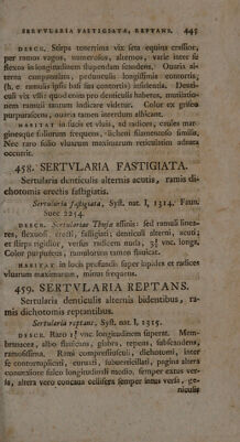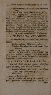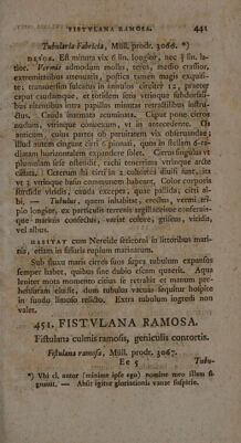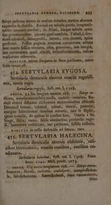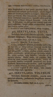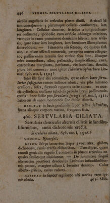 ![zd iam cuneiformes 3 plerumque:cellulas continentes, iam ' longiores.: Cellulae alternae, feriebus 2 longitudinali- ver ordinatae ,' globofae cum. orificio oblongo inferiore, ' vtrinque in ramo: prominent. denticulis bifetis, raro trife« tis, quae fetae i iam longiores, iam breuiores illam plumos ; famreddunt. — Filamenta alia fetacea, de quibus fyft. nat. l. c. siamdlflindi numerofa, peregrina autem efle pu«- to, paffim enim ramulis fine ordiie fixa funt, illosque : mire connedunt, alba, pellucida, fimpliciffima, cau; extremitate marginata, perforata, vix incraffata, flexilia; | plura bafi connexa: anne La Tubularia TM Line | Inter illa fuat alià commixtà, quae etiam inter fevtu- - ria cylindrica craffiora tabulofa petiolo breui paffim emit- tentia: haec facile pro ferzularia fyringa fyft nat. I, 1311«] haberem ab antea memoratis fine dubio diuerfa.- | - HABl1TAT in locis profundis fuper teftas deftru&s, fucos aliaque corpora marina, frequens fatis, / 460. SERTVLARIA CILIATA. Sertularia denticulis alternis ciliatis infundibu- liformibus, ramis dichotomis erectis. — ' - Sertularia ciliata, Syft. nat, I, 13 16.2 | | ^cnorNr, Nyaurfet, .- DESCR. Stirps. tenerrima faepe 3 vhc. ala, glabra; dichotoma, ramis erectis diftancibus. | Tam flipes, quam ramuli geniculis rugofis f. contortis in plures articulos ae- | quales fi milesque. diuiduntur, — De fummitate fi nguli | albido - grifeus, rarius rubens... tur. obuia. TAM | ; (00 461 SER-](https://iiif.wellcomecollection.org/image/b28756460_0468.jp2/full/800%2C/0/default.jpg)
