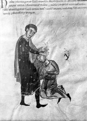 Credit: M0007397: Manuscript illustration from <i>Medicina Antiqua</i>, depicting a physician binding a leaf around a patient's throat. Source: Wellcome Collection.