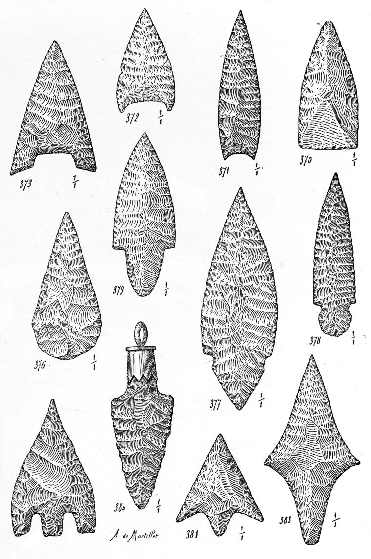 M0015021: Illustration of Neolithic and Bronze Age arrowheads made from different rock. In copyright. Source: Wellcome Collection.