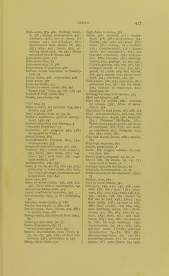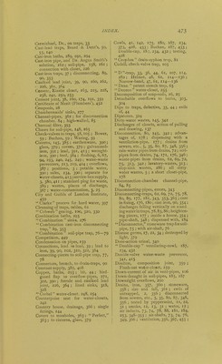 ![ends, 74, l8o ; open at both ends, 171, 172; short lengths untrapped, 39 ; ventilation and disconnection, 171 ; without traps, 4, 15, 64; badly ventilated, 6 ; unventilated, 3 ; foot- ventilation, 52 Soldered joint, wiped, 169, 202 Speculative building, 9 Spence metal joints, 163 Spigot outlet to earthenware trap, 227, 235. 238 ; compared with flanged outlet, 22S Spongy iron filter, 393. 396 Spun yarn and red-lead joint, 164 St. Ann's marble for water-closet floors, etc., 251, 268, 335, 336 Stable drainage. 66 Staircases, ventilated, 146 Standard plug for cistern-waste, 389 Stanford composition joint, 359 Stench .trap. Dean, patent, 65 Steps for urinals, 336 Stillroom sinks, 328 Stoneware, drains, 358 ; soil-pipe, 164; traps, 37, 65, 69, 75 Stop-cocks, 409. Stop-valves in rising mains, 408 Streets, miles in London, 8 Subways, 357 Sulphur joints, 164 Sun acting on outside pipes, 166 Supply of water; to fittings—too poor, 5, 16 ; to baths, 301 ; urinals, 340 Supply-valves and services, sizes, 466 Surface flrainage, 65, 66, 70 Surface-traps, 142, 364 Syphon flushing-cisterns, 193, 233, 240, 242, 245, 249, 281, 341 Syphon traps (round pipe traps), 106, 138, 141 ; to slop-sinks, 280 Syphon trap, Buchan, 59 Syphon trough-closet, 265 Syphon urinal, 333 Syphon water-waste-preventingcistems, 417 Syphonage of traps, 5, 106, 141, 280, 312 Syphonic action in traps, 57 Table-top to closets, 192 Table-top Hygienic closet, 154, 224 ; Optimus, 155, 209 Tables, various, 61, 434, 466 Tacks, 169 ■ Tanks, flushing, 6, 67, 94, 365, 423, 456 Teak seats for water-closets, 246 Technological examinations, 459 Telescope joints, 285 Terminals to vent-pipes, 41, 142, 175, 180, 187, 234, 373 ; badly positioned, 373—376 Tests, with water-closets, 155, 193, 457 ; plumbing and drainage, 11 ; peppermint, 11, 22, 31 ; smoke, 12, I3j 31 ; virater, 12 ; with traps, 154; for water-seal of traps, by gas, 30 ; ammonia, 31 ; assafcetida, 31 ; ether, 31 ; smoke, 31 Tier of lavatories, 313 ; water-closets, sinks, etc., 143 ; slop-sinks, 283 ; baths, 299 Tiled walls and floor of water-closets, 187, 219 Tin, pipes, 391 ; lining lead pipes, 391 ; lining wrought-iron pipes, 391 Tinned-iron baths, 294 Tip-up lavatories, 307, 312, 314 Trades Unions, 449 Traps. 4, 15, 27, 31, 36, 40, 47 Drainage and Disconnecting, etc., 62, 69, 80, 365 ; Anti-syphon, 140 ; Buchan, 82 ; Combina- tion soil - pipe, 76—79, 89 ; Croydon, 81 ; Dean, 65 ; Dis- connector, 75 ; Drain-sentinel, 81, 83, 349 ; Lip, 66; Manhole drain-syphon, 80; Mansergh, 63 ; Scott-Moncrieff, cast-iron, 354 ; Sewer-interceptor, 350 ; Triple-dip, 62; Ventilatingdrain- syphon, 81 ; Weaver, Venti- lator, 83 ; grease-traps, 91, 324, 330 also Grease ] Plumbers' Traps, 21 : Antill, 43 ; Anti-D, 52, 58, 61, 105, 139, 154, 201, 204, 224, 249, 2S0, 300, 313, 321, 330 ; Beard & Dent, patent cast-lead, 50, 55, 140; Bell, 21, 36, 42, 324 ; D, 33, 36, 44, 61, 107, 114, 282; Du Bois, 58, 114— 136 ; Eclipse, 48, 61, 114—136, 139 ; Helmet D, 48, 61, 114— 136; Half-S, 29, 55 ; Mansion or V-dip, 50 ; Narrow-band D, 47, 61, 114—136; Round pipe, 33, 106, 138, 141; S, 55 ; U- shaped, 57, 61 Mechanical, 58, 105 : Bower, 59, 105, 107, 114 ; Buchan, 59, 105 ; Cudell, 105 ; Waring, 59, Trapless, soil-pipes and waste-pipes, 4, 15, 64; water-closets, 26 \see also Water-closets] Traps, material, 36; cast-iron, 37; drains, 89; earthenware, 37, 39 ; lead, 36, 41 ; weight, 41 ; stoneware, 37. 65, 69, 75 ; zinc, 37 ; necessity of, 15 ; advantages of, 27 ; as collec- tion bo.\es, 4, 8 ; as doorways, 35 ; as sentinels, 33 ; for house plumbing, 35 ; independent of fitting, 37, 201 ; and fitting in one piece, 38 ; sound jointing with waste-pipe, 36; defec- tive jointing to pipe, 38 ; connection with .soil-pipe, 154, 202 ; one to several fittings, 315, 316; one to several soil-pipes, 177; connecting](https://iiif.wellcomecollection.org/image/b20385353_0534.jp2/full/800%2C/0/default.jpg)