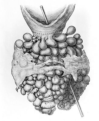 M0019636: Illustration of racemose sarcoma of the neck of the uterus, 1917