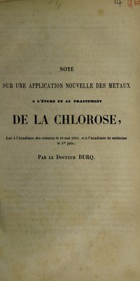Note sur une application nouvelle des métaux à l'étude et au traitement de la chlorose : lue à l'Académie des sciences le 18 mai 1852, et à l'Académie de médecine le 1er juin / Par le docteur Burq.