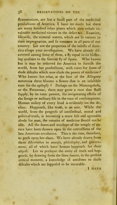 ![APPENDIX: CONTAINING] THE NEW METHOD OF Inoculating for the Small-Pox. ©SLIVERED IN A LECTURE IN THE UNIVERSITY OF PENIlf SYJLVANIA, ON THE 20th OF FEBRUARY} ALSO, OBSERVATIONS ON THE Duties of a Phyfician, AND THE METHODS OF IMPROVING MEDICINE, ACCOMMODATED TO THE PRESENT STATE OF SOCIETY AND MANNERS IN THE UNITED STATES. * DELIVERED IN THE UNIVERSITY OF PENNSYLVANIA, ON THl} 7th OF FEBRUARY 1789, AT THE CONCLUSION OF A COURSE OF LECTURES U PON CHEMISTRY AND THE PRACTICE OF PHYSIC. PUBLISHED AT THE REQUEST OF THE CLASS. B Y BENJAMIN RUSH, M. D. PROFESSOR OF CHEMISTRY IN THE UNIVERSITY PENNSY L VANIA. THE SECOND EDITION WITH ADDITIONS. PHILADELPHIA: 9 mnted and sold by PRICHARD & HALLt in makKSvk STREET NEAR FRONT STRICT, W.O«C,lXXXIX,](https://iiif.wellcomecollection.org/image/b21690224_0003.jp2/full/800%2C/0/default.jpg)
