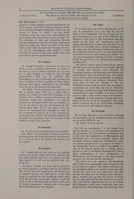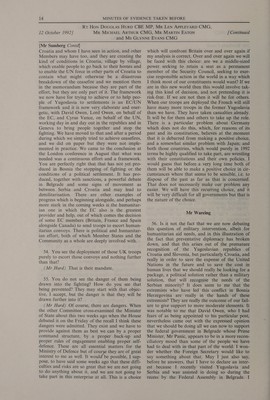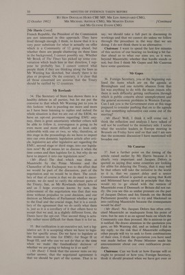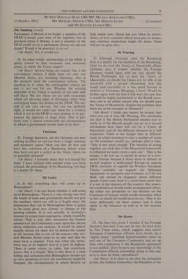 ![12 October 1992] [ Continued [Mr Sumberg Contd] Parliament, if Britain is no longer a member of the ERM? I accept your view of the legalities, but in practical terms if Britain is not a member of the ERM could we as a parliament discuss an opt-out clause? Would it be practical to do so? (Mr Hurd) No, it would not. 29. In other words, membership of the ERM is pretty crucial to that economic and monetary union, to which the Treaty relates? (Mr Hurd) Several things are crucial. One is the convergence criteria. I think there are only two Member States, not including Germany, who at the moment meet the convergence criteria. The question as to when the convergence criteria are met is not one for me. Whether the existing timetable of the Treaty is realistic or not only time will show. We are where we are with economies which are showing signs of diverging rather than converging hence the strains on the ERM. The sec- ond is our own opt-out, but you are perfectly right, it would not make any sense for a country which is not in the ERM to start putting to its par- liament the question of stage three. That is per- fectly true. I cannot conceivably see circumstances in which a government would want to do that. Chairman 30. Foreign Secretary, are the Germans not now seeking in effect an opt-out from a single currency and monetary union? How can they do that and have this condition of a Bundestag debate when they have not got a codicil in the Treaty which we so painfully debated? (Mr Hurd) 1 honestly think that is a matter for them. I have noticed with interest what you have noticed, the proceedings of the Bundestag, but that is a matter for them. Mr Lester 31. Is this something that will come up in Birmingham? (Mr Hurd) 1 do not know whether it will come up in Birmingham. There is a very strong view that the heads of state and government should not give the markets, which are still in a fragile state, the impression that out of Birmingham there is going to be some great new scheme or change to the existing scheme. It is not actually in anybody’s interest to create that expectation, which would be unreal. That is why after discussion the finance ministers of the Community came upon this phrase about reflection and analysis. It would be almost equally unreal for them not to discuss the matter at all, because this is one of the reasons why sev- eral Member States came to us and said that we must have a summit. That was when the turbu- lence was at its highest; now it is past its highest. There is some return to calm, but everybody knows that it is fragile. That is why there is a clear feeling and consensus that Birmingham should not go into questions of how the mechanism might be changed, the circumstances in which Britain or Italy might join, (Spain has not lifted its restric- tions), or how countries which have put on tempo- rary currency restrictions might lift them. These will not be gone into. Mr Wareing 32. Although obviously what the Bundestag does is a matter for the members of the Bundestag, what we do over the Treaty of Maastricht affects Germany also. I wonder whether the Foreign Secretary would agree with me that should the British Parliament fail to pass the Treaty of Maastricht, or should the Danes not be able to be successful with a second referendum, that this would lead inevitably to a two speed Europe in relation to European Monetary Union? Would he further agree with me that if this were the case that it would be highly detrimental to the British econ- omy and is an added reason why we should pass the Treaty of Maastricht, despite the problems that there are at the moment in Denmark? (Mr Hurd) | think one cannot be certain that what you say is true, Mr Wareing. The certainties are that if the British Parliament decides not to ratify or if the Danish people say no in a second referendum then there will not be a Treaty of Maastricht and all the different elements in it will evaporate. There is the danger that in different ways, in which monetary is one, a number of states on the continent would say, perhaps after a time, “This is not good enough. The benefits of acting together are such that if the Maastricht framework is collapsed we must create a new one”. That is the danger. I do not see it myself in terms of a two- speed Europe because I think there is already in several respects a multi-speed Europe as regards ERM, certainly as regards the Western European Union, certainly as regards the Schengen Agreement on passports and frontiers, so I do not think one should be dogmatic about different speeds. I just come back to a more basic point that it is not in the interests of this country that power- ful combinations should make arrangements affect- ing either our prosperity or our security on the Continent of Europe which would intimately affect us but on which we would have no say. That is my basic philosophy on these matters and it does apply in the financial as well as in the security field. Mr Harris 33. On that very point I wonder if the Foreign Secretary has seen, I am sure he has, the lead story in The Times today which suggests that senior European Commission officials have drawn up a “secret treaty” enabling federal-minded states to pull out of the European Community and set up their own community if the Maastricht agreement is not ratified. Does he have any knowledge of the Commission officials proceeding along in this way or is it, does he think, speculation? (Mr Hurd) It is clear to me that the principals in this, the Federal Chancellor, the President of the](https://iiif.wellcomecollection.org/image/b32218977_0025.jp2/full/800%2C/0/default.jpg)