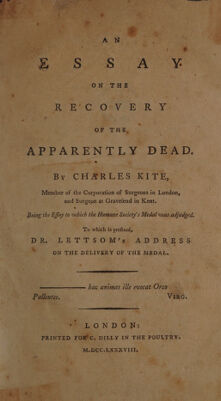 An essay on the recovery of the apparently dead / By Charles Kite ... Being the essay to which the Humane Society's Medal was adjudged. To which is prefixed, Dr. Lettsom's address on the delivery of the Medal.