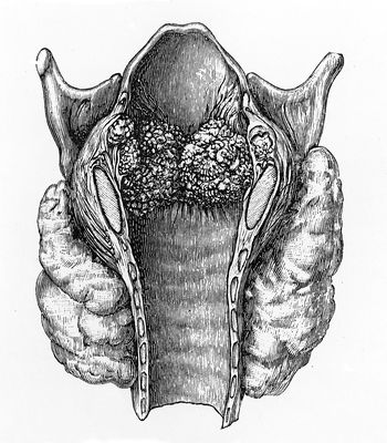 Credit: M0019672: Illustration of the larynx of a child showing warts, 1922. Source: Wellcome Collection.