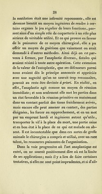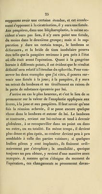 ![supposons avoir une certaine étendue, et cet écoule- ment s'opposant à ]a cicatrisation, il y aura une fistule. Aux paupières, dans une blépharoplastie, le même ac-r cident n^aura pas lieu, il n'y aura point une fistule, du moins dans le deuxième groupe ; mais si la sup- puration y dure un certain temps, le lambeau se déformera, et la bride de tissu inodulaire pourra être telle que la paupière revienne à peu près à l'état où elle était avant l'opération. Quant à la gangrène bornée à différents points, il est évident que le résultat définitif sera relatif à l'étendue du sphacèle. Pour con- server les deux exemples que j'ai cités, il pourra sur- venir une fistule à la joue; à la paupière, il y aura un retrait du lambeau et un tiraillement en raison de la perte de substance éprouvée par lui. J'arrive au cas le plus heureux, et c'est le lieu de se prononcer sur la valeur de l'anaplastie appliquée aux lèvres, à la joue et aux paupières. Il faut savoir qu'une fois la réunion achevée, il se passe encore quelque chose dans le lambeau et autour de lui. Le lambeau se contracte, revient sur lui-même et tend à devenir globuleux, à se recoqueviller dans un point ou dans un autre, ou en totalité. En même temps, il devient plus dense et plus épais, sa couleur devient peu à peu semblable à celle des parties voisines ; si quelques bulbes pileux y sont implantés, ils finissent ordi- nairement par s'atrophier ; la sensibilité , quoique toujours un peu obtuse, y revient d'une manière assez marquée. A mesure qu'on s'éloigne du moment de l'opération, ces changements se prononcent davan-](https://iiif.wellcomecollection.org/image/b21074653_0037.jp2/full/800%2C/0/default.jpg)