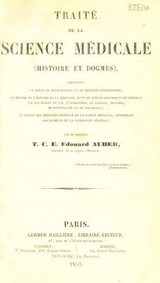 Traité de la science médicale : histoire et dogmes comprenant un précis de méthodologie ou de médecine préparatoire; un résumé de l'histoire de la médecine, suivi de notices historiques et critiques sur l'écoles de Cos, d'Alexandrie, de Salerne, de Paris, de Montpellier et de Strasbourg; un exposé des principes généraux de la science médicale, renfermant les éléments de la pathologie générale / par T.C.E. Édouard Auber.