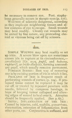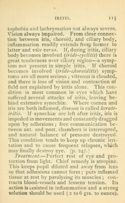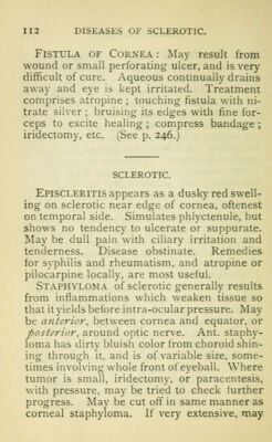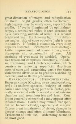![great distortion of images and reduplication of them. Slight grades often overlooked ; high degrees may be easily seen, especially in profile. If eye is illuminated by ophthalmo- scope, a central red reflex is seen surrounded by a dark ring, outside of which is a second bright red ring. By throwing light from differ- ent angles, side of cone opposite light is seen in shadow. If fundus is examined, everything appears distorted. Treatment unsatisfactory. Little improvement of vision from glasses. Stenopeic slit occasionally of use. All straining of eyes must be avoided. Opera- tive treatment comprises iridectomy, iridode- sis, trephining, and Graefe's operation, which consists in removing superficial flap from apex of cone and cauterizing part a few times with nitrate silver, so as to produce a shrinking cicatrix, and so flatten protrusion. Kerato-globus : Hydrophthalmia : Buphthalmos (Gr. |3ous, an ox, and ocpZaXixns, eye] : Is uniform spherical bulging of entire cornea and neighboring part of sclerotic, gen- erally associated with increased size of anterior chamber and tremulous iris and lens. Con dition generally congenital ; may appear after inflammation. Cornea may remain transpar- ent or become cloudy, especially at margin. Causes great impairment of vision, changes in deeper tissues and often ultimate blindness. Treatment of little use. Iridectomy seems tc do most good.](https://iiif.wellcomecollection.org/image/b21025654_0133.jp2/full/800%2C/0/default.jpg)