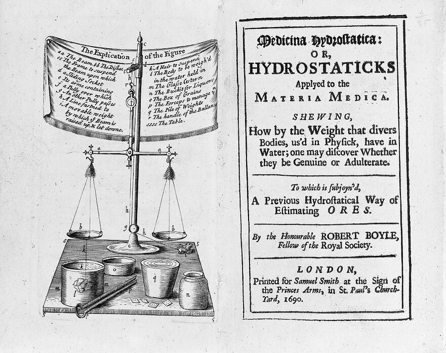 Credit: M0011927: Reproduction of the title page and illustrated frontispiece from Robert Boyle's Medicina hydrostatica, 1690. Source: Wellcome Collection.
