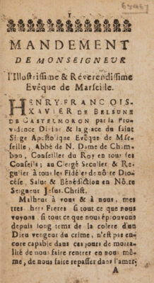 Mandement [concerning the plague at Marseilles] / [Henri François Xavier de Belsunce de Castelmorón].