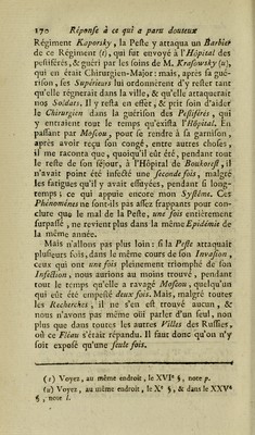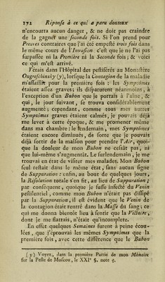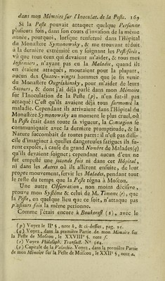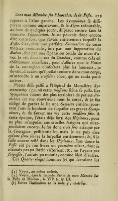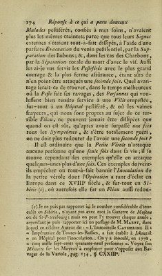 ![Malades peftifércs, confiés à mes foins, n’avaient plus les mêmes craintes; parce que tous leurs Signes externes s’ctaient touc-cà-fait diffipés, à l’aide d une Evacuation du venin pefiilentiel, par la Sup- puration des Bubons ; &c, dans les cas des Charbons , par la Séparation totale du mort d’avec le vif. Au.iïi les ai-je vus fervir les Pefhjétés avec le plus grand courage «Se la plus ferme afsûrance, étant sûrs de n’en point être attaqués une féconde Jois. Quel avan- tage lerait-ce de trouver, dans le temps malheureux où la Pefzc {-ait fes ravages, des Perjonnes qui vou- luffent bien rendre fervice à une ^/7/e empeftée, fur-tout à un Hôpital peRifcré, & où les vaines frayeurs, qui nous font propres au fujet de ce ter- rible Fléau, ne peuvent jamais être diffipées que quand on efi: sûr, qu’aprcs avoir furpalfé une fois tous les Symptômes , & s’être totalement guéri, on ne doit plus redouter de l’avoir une fécondé fois ? Il eft ordinaire que la Petite Vérole n’attaque aucune perl'onne qu’une feule fois dans fa vie ; il le trouve cependant des exemples qu’elle en attaque quelques-unes plus à! une fois. Ces exemples doivent- ils empêcher ou tout-à-fait bannir ]éInoculation de la petite vérole dont ^Opération a tant d’éclat en Europe dans ce XVIIP ficelé , &r fur-tout en Si- bérie {c), oû autrefois elle fut un Fléau auiTî redou- (c) Je ne puis pas rapporter iô le nombre confidérable d’ino- culés en Sibérie , n’ayant pas avec moi la Gazette de Mofeou ou de St-P<tershourf;', mais on peut Ij trouver chaque année ; cependant je puis rapporter ici un paflage de M. Marit, dans lequel ce célébré Auteur dit : « L’Immorrelle Catherine II : tt Impératrice de Toiites-les-Ruflies, a fait établir à Irkoutsk « un Hôpital pour l’inoculation.On y a inoculé, en 1778, *. cinq mille fept-cents quarante-neuf perfonnes ■<*. Voyez fon Mémoire fu’’ les Moyens à employer pour s’oppofer aux Ra- vages de la Variole, pag. 13 4 , f CXXIII*.](https://iiif.wellcomecollection.org/image/b28760931_0186.jp2/full/800%2C/0/default.jpg)