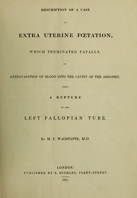 Description of a case of extra uterine foetation, which terminated fatally, by extravasation of blood into the cavity of the abdomen, from a rupture of the left Fallopian tube / by M. F. Wagstaffe.