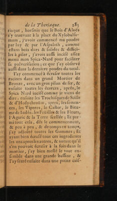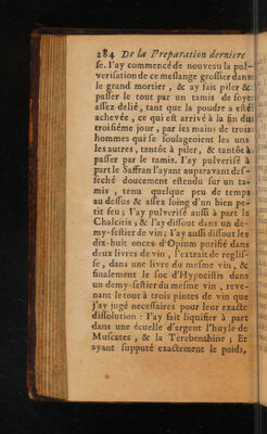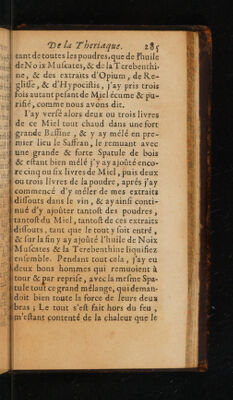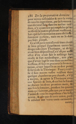 ![LUI 2838 De la preparation derniere |; EN pour mieux raffembler & unir la vertu Hal | de tousles ingrediens, par la fermenta- ll tion du total faite dansun mefme vaif Les ll feau,n yayantrien quiempéche qu or}; Hi nedivife letouten plufieurs vaifleaux.4,;. TN J {PIE lors que la fermentation aura efté fuf-1 tnt famment parfaite, mais on ne le doit. [RM pas faire plütoft. {| Cen’eft pas le tout d’avoir bien choifi & bien preparé feparément toutes lesd,. fer droguesdenôtre Theriaque, ni deles}, avoir bien difpenfées;Ce n'eft pas au aflez d'en avoir fait le mélange fortil,, exacte & fort methodique , non plus. que d’avoir logé le tout dansun mefmedl, HUE vaifleau ; 11 faut en procurer la fermen:4}!, quil tation ,avant laquelle on nedoit pointil® 4 {e fervir de la Theriaque. Pour yreüf-4} pi fir il faut mettre voftre vaifleau dans, À quelque chambreun peu chaude, s’il y LETR a moyen, &agiter la Theriaque avec. Ÿ | une Spatule de bois, deux fois la fematai; ” }. | nc:durant les deux premiers mois, &, | une fois la femaine, pendant les quatres! mois qui fuivront,afin que par Ce moy l'union de tous les ingrediens s’en fafled mieux, & afin que de cette union, puif4 t Ce refulter une vertu toute extraordi- [ii HR nairc..l alLi]](https://iiif.wellcomecollection.org/image/b32992233_0324.jp2/full/800%2C/0/default.jpg)