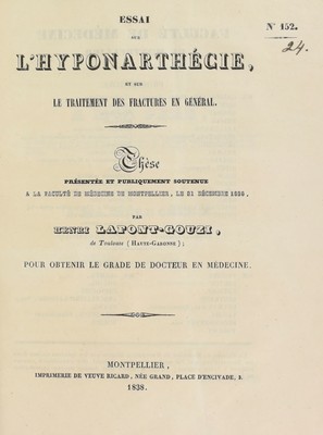 Essai sur l'hyponarthécie, et sur le traitement des fractures en général : thèse présentée et publiquement soutenue à la Faculté de médecine de Montpellier, le 31 décembre 1838 / par Henri Lafont-Gouzi.