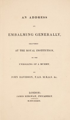 An address on embalming generally, delivered at the Royal Institution, on the unrolling of a mummy / [John Davidson].