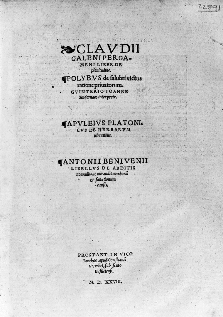 M0009005: Galen: <i>Claudii Galeni ...Liber de plenitudine</i>, 1528: title page. Public Domain Mark. Source: Wellcome Collection.