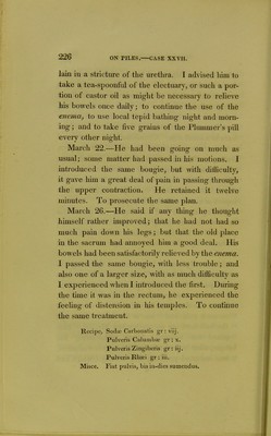 A practical essay on stricture of the rectum; illustrated by cases, showing the connection of that disease with prolapsus of the rectum, irritation of the lungs, affections of the urinary organs, and of the uterus, fistula, &c.; to which is now added, some practical observations on piles, and the haemorrhoidal excrescence / by Frederick Salmon.