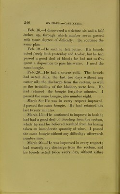A practical essay on stricture of the rectum; illustrated by cases, showing the connection of that disease with prolapsus of the rectum, irritation of the lungs, affections of the urinary organs, and of the uterus, fistula, &c.; to which is now added, some practical observations on piles, and the haemorrhoidal excrescence / by Frederick Salmon.