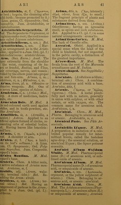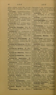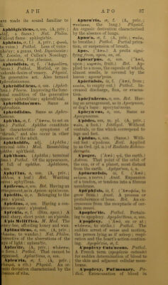 ![ave made its soxmd familiar to U. AplilSgls'flcus, a, urn. (A, priv.; >5o^, a flame.) A^at Philos. Without flame: aplilogis'tic. Aphonia, or, f.) A, priv.; ^xavh, tie voice.) Pathol. Loss of voice : pho'ny; a genus, Ord. Dyscinesice : !i. Locales, of Cullen’s Nosology, lee Anaudia, Vox Abscissa. AplirOdlsia, oe, f. (’AcftpobiTr], ^’enus.) Pathol. Morbid, or im- loderate desire of venery. Physiol. 'he generative act. Also termed {^hrodisiasmiLS. AphrOdlsi'iiciis, a, um. {Aphro- ’/isia.) Pharm. Improving the func- ional condition of the generative i^ans ; aphrodi'siac; aphrodi'sial. AphrOdisias’mns. Same as \phrodisia. AphrOdisins. Same as Aphro- lisiacus. Apli'tha, OE, f. A'jt'tw, to set on ire.) Pathol. Aphthae constitute he characteristic symptoms of ‘thrush,” and also occur in other liseases of the adult. Aphthoides, adj. {Aphtha; erminal -Ides.) Med. Eesembling phtha: aph'thoid. Apli'thous. {Aphtha; terminal osus.) Pathol. Of the appearance, r full of aphthae. AphtJwsus, um. Apliyl'lns, a, um. (A, priv.; wWou, a leaf.) Bot. Wanting eaves: aphyllous. ApiScens, a, W7W-. Bot. Having an .rrangement,as in Apium; apia'ceous. ApIcMls, is, e. Belonging to the pex: a'pical. Apicatns, a, um. Having a con- picuous apex; a'picated. Apl'cula, OB, f. (Dim. apex.) A mall sharp, short point: an a'picule. A’pis Mclll'flca. M. Med. The loney-bee, affording honey and wax. Apliina'tlcns, a, um. (A, priv.; rXai/ao), to wander.) Nat. Philos. Corrective of the aberrations of the ays of light: aplana'tic. Aplas'tic. (A, priv.; TrXaoro-w, 0 form.) Pathol. That cannot be irganised. Apladticus, a, um. Apleii'rla, ae, f. (A, priv. ; rXeu/oct, a rib.) Physiol. An or- :anic deviation characterised by the .bsence of ribs. Apnen'ria, ob, f. (A, priv.; irveufiuiv, the lung.) Physiol. An organic derivation characterised by the absence of lungs. Apnoe'a, ob, f. (A, priv.; irveuy, to breathe.) Pathol. Partial priva- tion, or suspension of breath. Apo>. (’Atto.) a prefix signi- fying/ro?«-, upon, on, at. Apttcar’pws. a, um. { ’Atto, upon; Kapiros, fruit.) Bot. Ap- plied to a moss, the capsule of which, almost sessile, is covered by the leaves ; apocar'pous. Apdcgnosi.«, is, f. {'Atto, from ; K6VOU), to empty out.) Pathol. In- creased discharge, flux, or evacua- tion. Apttcynaccns, a, um. Bot. Hav- ing an arrangement, as in Apocynum, or dog’s bane : apocyna'ceous. Apttcyn'eiis, a, um. Same as Apocynacem. A'pddes, um, m. pi. (A, priv. ; TToi/s, a foot.) Ichthyol. Without ventrals, or fins which correspond to legs and feet. A'pddns, a, um. (Same.) With- out feet: a'podous. Zobl. Applied to an Ord. (pi. n.) of Radiata Echino- demyata. A'pogee. ( ’Atto ; yT], the earth.) Astron. That point of the orbit of the sun, or of a planet, most distant from the earth. Apogcdum, i, n. Apdneurosis, is, f. ( ’Atto ; vevpov, a nerve.) Anat. Expansion of a tendon, or tendons into a fibrous membrane. ApO'pbysis, is, f. ( 'ATrocpaot), to grow from.) Anat. A process or protuberance of bone. Bot. An ex- crescence from the receptacle of cer- tain musci. Apoplec/tic. Pathol. Pertain- ing to apoplexy. Apopledtlcus, a, um. A'poplexy. ( ’Atto, on or at; TrXuffcrw, to strike.) Pathol. The sudden arrest of sense and motion, the person lying as if asleep ; respi- ration and the heart’s action continu- ing. Apopldxia, oe, f. A'poplexy Ciita'ncons. Pathol. A French term {apoplexie cutante) for sudden determination of blood to the skin and adjacent cellular mem- brane. A'poplexy, Pul'monary. Pa- thol. Extravasation of blood in](https://iiif.wellcomecollection.org/image/b24862393_0055.jp2/full/800%2C/0/default.jpg)