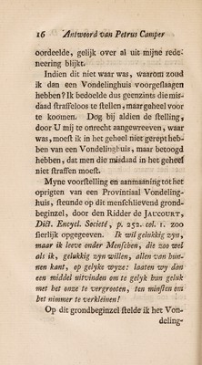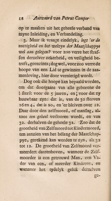Gedagten ... over de misdaad van kindermoord; over de gemakkelyke wyze om vondelinghuizen in te voeren; over de oorzaaken van kindermoord: en over zelfmoord. Dienende tot antwoord op de ongegronde aanmerkingen van ... S. M. V. D. [i. e. A. Sterk] Waar by gevoegd zyn twee zaakelyke proeven over de inblaazing der lucht in de longen an kinderen, die dood ter werreld gekoomen zyn / [Petrus Camper].