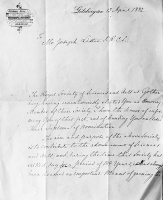 M0019550EA: Letter to Joseph Lister from the Royal Society of Sciences and Arts in Gothenburg, 1882