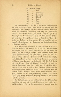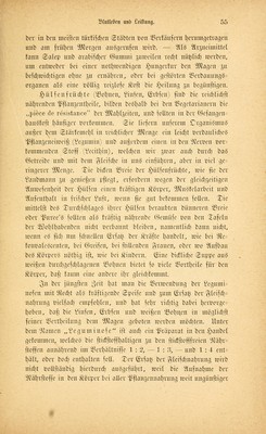 ![ber in beu metjten türltfd^en ©tobten bon SJerfäufem herumgetragen unb am frühen Söftorgen aufgerufen wirb. — %l§ Strsneimittel fauu Salep unb arabifdjer ©ummi ^Weiten redjt nti$Ktf) werben, um enttoeber bei einer notfywenbigen ^ungerfur beu Sttagen §u befdjwidjtigen ol^nc 31t ernäbren, ober bot gehörten 2terbauung§= Organen al-3 eine ööECig reigtofe itoft bie Teilung 31t 6egünftigen. hülfen früdjte (Sßoljnen, Sinken, ©rbfen) ftnb bie reiddidift näfyrenben ^flau3eutl)ei(e, bilbcu bes'fycilb bei ben SSegetarianern bie „piece de resistance bor SKafylgeiten, unb feilten in ber (Sefangen= fyauö'foft fjäufiger öörtommen. ©ie liefern unferem Organismus außer beut ©tarfemef)! in reichlicher äftenge ein leid)t berbautidjeS s.ßf)(anäeneiweiß (Segumin) unb außerbem einen in beu Heroen oor= t'ommenbeu Stoff Vecitl)iu), Weidjen Wir jwar and) burd) baS ©etreibe unb mit bem g-leifdje in unS einführen, aber in öiel ge= rtngerer Süftenge. £ic biden üßreie ber §ülfeufvüd)te, wie fie ber Sdnbmann 31t genießen pflegt, erforbern wegen ber gleichzeitigen StnWefenfyeit ber hülfen einen fräftigen Äörper, Tüftelarbeit unb Slufenttyalt in frifdjer Vuft, wenn fie gut befömmen foden. 3)ie mittelft beS SDurcfyfdjlageS ifyrer hülfen beraubten bünneren Breie ober ^ßuree'S füllten als fräftig näfyrcnbe ©emüfe t>on beu Safein ber ÜSSofylfyctbenben nid)t bevbauut bleiben, namentlich bann uidit, Wenn eS (id) nnt fdmelleu ©rfa|3 ber Gräfte l)anbelt, wie bei 9te= fonbaleSeenten, bei ©reifen, bei ftiüenben grauen, ober Wo Stufbau bcS $ ßrperS uötln\] ift, wie bei .vtiubern. (Sine bitflidje 3uppe au§ Weißen burdjgefdjlagenen 33ol)ueu bietet fo oiele 33ortl)eile für beu .forper, baß faiun eine anbere i()r gleidjfommt. $n ber jiunjftcu ßett l)at man bie SSerwenbung ber 8egumi= nofeu mit 9ied)t aU fräftigenbe Speife unb 311m ©rfa^ ber $leijd)= nafyrung inelfad) empfohlen, unb fyat fefyr richtig babei t)eroorge= tjoben, baß bie Sinfen, GSrbfen unb Weißen ißclmcn in möglidjft feiner SBertfyeilung bem SJtagen geboten werben mödjten. Unter bem tarnen „Seg'uminofe ift audi ein Präparat in ben: Raubet gelommen, WeldjeS bie ftidftofffyaltigen 31t beu ftidftofffreien 9caljr= jtoffen annä()renb im SBerfyältniffe 1:2, — 1:3, — unb 1 : 4 ent= l)ält, ober bodi enthalten foft. £)er ©rfafc ber gleifd)iiat)rung wirb nid)t bottftänbig l)ierburd) ausgeführt, weil bie ?lufual)me ber Sftäfyrfioffe in ben Äörper bei aller ^flanjennaljrung weit ungünfiiger](https://iiif.wellcomecollection.org/image/b21006878_0067.jp2/full/800%2C/0/default.jpg)