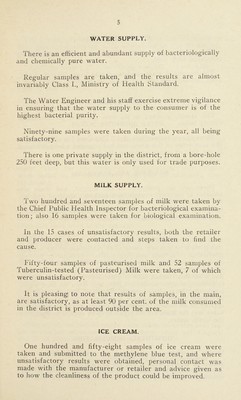 ![WATER SUPPLY. There is an efficient and abundant supply of bacteriologically and chemically pure water. Regular samples are taken, and the results are almost invariably Class I., Ministry of Health Standard. The Water Engineer and his staff exercise extreme vigilance in ensuring that the water supply to the consumer is of the highest bacterial purity. Ninety-nine samples were taken during the year, all being satisfactory. There is one private supply in the district, from a bore-hole 250 feet deep, but this water is only used for trade purposes. MILK SUPPLY. Two hundred and seventeen samples of milk were taken by the Chief Public Health Inspector for bacteriological examina- tion ; also 16 samples were taken for biological examination. In the 15 cases of unsatisfactory results, both the retailer and producer were contacted and steps taken to find the cause. Fifty-four samples of pasteurised milk and 52 samples of Tuberculin-tested (Pasteurised) Milk were taken, 7 of which were unsatisfactory. It is pleasing] to note that results of samples, in the main, are satisfactory, as at least 90 per cent, of the milk consumed in the district is produced outside the area. ICE CREAM. One hundred and fifty-eight samples of ice cream were taken and submitted to the methylene blue test, and where unsatisfactory results were obtained, personal contact was made with the manufacturer or retailer and advice given as to how the cleanliness of the product could be improved.](https://iiif.wellcomecollection.org/image/b28876131_0007.jp2/full/800%2C/0/default.jpg)