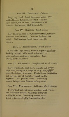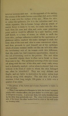 ![interval between each cast. At the approach of the casting, the colours of the snake become somewhat dull, and a white film is seen over the surface of the e}7e. When the skin, or rather the epidermis (for it is the colourless scarf skin which separates, like in human beings after an attack of scarlet fever) is ready to be cast, the snake rubs the skin back from his nose and chin, and seeks some projecting point such as would be afforded by a split bamboo, some stiff thatch, or a heap of stones, on which to catch the loose skin; perhaps adhesion is aided by the application of glutinous saliva; anyhow the snake manages to stick the loose skin of the nose and chin to some convenient object, and then proceeds to peel himself out of his epidermis which of course remains inside out like an eel’s skin after the involuntary exit of its tenant—with this difference, that the snake has had numerous opportunities, denied to the eel, of becoming used to the process. The cast skins are beautiful objects, there is often not a break in them from nose to tip. The epidermal covering of the eye comes off along with the rest of the skin, and eveiy scale, every keel is distinctly marked ; colour alone is absent,* but even without it the kind of snake to whom the skin belonged can often be identified.-]- They are very delicate and fragile, and are liable to destruction by mites unless kept shut up along with camphor. The cast skin of a Ptyas mucosus, 9 feet long, weighs 130 grains or a little over a quarter of an ounce. * The pattern of the Python and of some Dipsadidce is visible in their cast skins. t When I was stationed at Kamptee in 1868, the house I occupied, jointly with a brother-officer, also gave shelter to a cobra and a pair of Bungarus arcuatus. I never saw them, but easily identified them by the skins they periodically cast. The cobra lived on my friend’s side of the house, the other snakes lived in a hole in the wall under my dressing table.](https://iiif.wellcomecollection.org/image/b28051609_0061.jp2/full/800%2C/0/default.jpg)