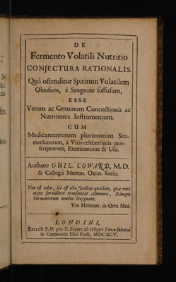 De fermento volatili nutritio conjectura rationalis ... Cum medicamentorum plurimorum stomachicorum ... examinatione et usu / [William Coward].