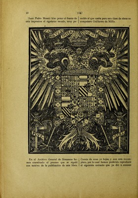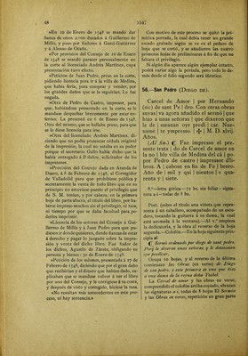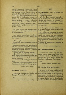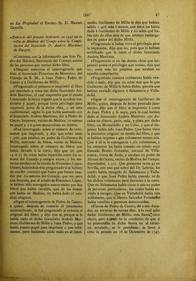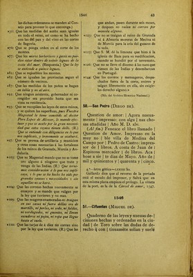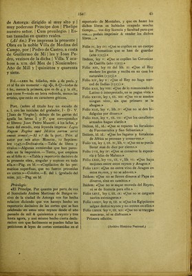 ![las dichas ordenanzas se manden al Con- sejo para proveer lo que convenga.) »3i: Que las medidas del aceite sean iguales en todo el reino, así como se ha hecho con las del pan y del vino en las cortes de Segovia. ¡►76: Que se ponga orden en el corte de los montes. »77:- Que los moros berberiscos y gazis no pue- dan estar dentro de veinte leguas de la costa del mar. (Respuesta.) Que la ley se entiende a quince leguas. »81: Que se repueblen los montes. >>82: Que se igualen las provincias según el número de vecinos. *87: Que las medidas de los paños se hagan en tabla y no al aire. »92: Que ningún asistente, gobernador ni co- rregidor sea proveido hasta que sea vista su residencia. »93: Que se recopilen las leyes de estos reinos, y se quiten las superfinas, pues Vtiestra Magcstad lo tiene cometido al doctor Pero López de Alcocer, lo mande efec- tuar y que se acabe por la gran necessi- dad que estos reynos tieneii dello. (R.) Que se entiende con diligencia en lo que nos suplicáis, y brevemente se acabará. »97: Que se provea de artillería y munición y otras cosas necesarias á las fortalezas de los reinos de Granada, Murcia y An- dalucía. »I03; Que su Magostad mande que no se tome oro qlguno á ninguno que trate y venga de las Indias. (R.) Que teme- mos consideración á lo que nos supli- cays, I lo que se ha hecho ha sido por grandes causas z necessidades z sin aquellas no se hará. »I04: Que las coronas hechas nuevamente se ensayen y se mande que valgan por la ley que tuvieren y no mas. >>109: Que las mugeres enamoradas «o traigan en sus casas ni fuera dellas oro de martillo, ni perlas, ni seda, ni faldas, ni verdugados, ni guantes, ni lleven escuderos ni pajes, ni ropa que llegue hasta el suelo. >110: Que las tarjas de á diez no corran sino por la ley que tuvieren. (R.) Que las que andan, pasen durante seis meses, y después no valan ni corran por moneda alguna. >>123: Que no se traigan al reino de Granada ni á Almería moreras de Mecina ni de Murcia para la cria del gusano de la seda. >>125: Que S. M. dé la limosna que hizo á la iglesia de Baza para su reedificación, cuando se hundió por el terremoto. »I26: Que no se lleve el diezmo á las naos que vienen de las Indias y desembarcan en Portugal. >>144: Que los correos y mensageros, despa- chados fuera de la corte, entren y salgan libremente en ella, sin exigir- les derecho alguno.» (Bib. del Archivo Histórico Nacional.) 50. —San Pedro (Diego de). Question de amor: | Agora nueua- mente ] impresso: con algu | ñas cho- sas añadidas | Año M. D. xlv. (yí/fin^ Fenesce el libro llamado | Question de Amor. Impresso en la muy no | ble villa de Medina del Campo por i Pedro de Castro: impres- sor de | libros. A costa de Juan de I Espinosa mercader j de libros. Acá | bose a sie | te dias de Mayo. Año de | mil y quinientos y | quarenta y | cinco. 0 4.®—letra gótica—lxxiiii hs. Gallardo dice que al reverso de la portada está el escudo del impresor, y Salvá que en esta misma plana empieza el prólogo. La viñeta de la port. es la de la Cárcel de amor, 1547. 1546 51. —Cifuentes (Miguel de). Quaderno de las leyesy nueuas de-1 cisiones hechas y ordenadas en la ciu- dad I de Toro sobre las dudas de de- recho q con 1 tinuamete solian y suele](https://iiif.wellcomecollection.org/image/b24853148_0061.jp2/full/800%2C/0/default.jpg)
